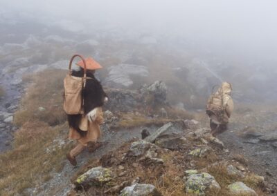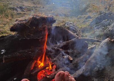 Ce fut également l’occasion de tester notre équipement néolithique. Les chaussures ont été durement éprouvées avec l’humidité constante. Les vêtements de fourrure ont été très appréciés surtout pendant les gelées nocturnes et le brouillard. Dans l’ensemble ce fut une belle expérience, riche en apprentissages.