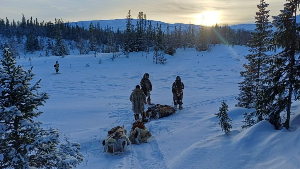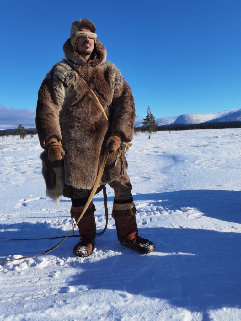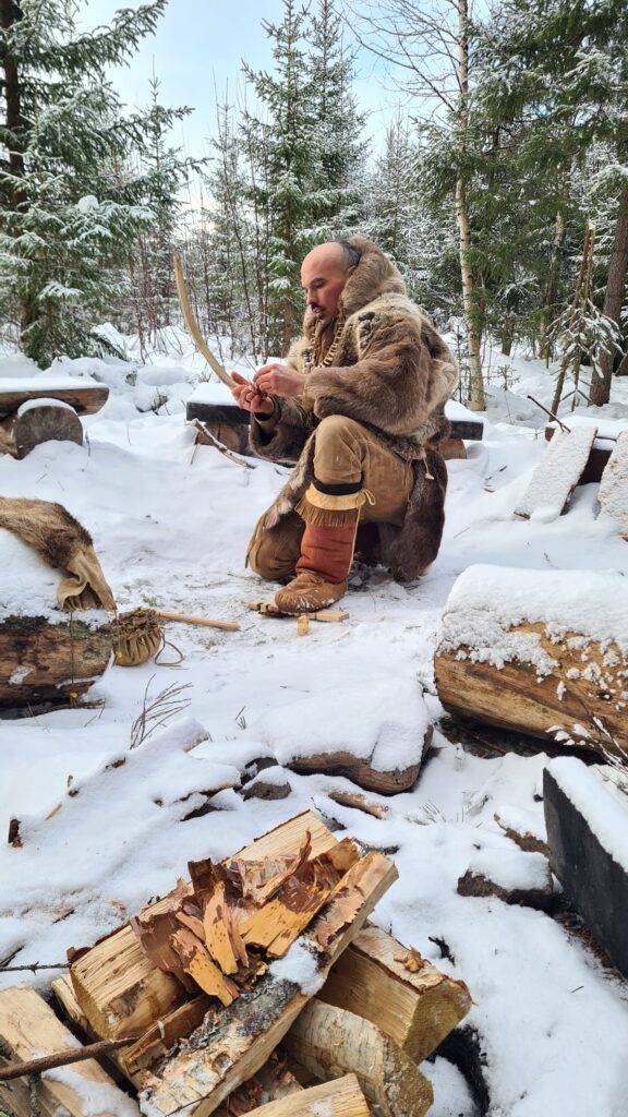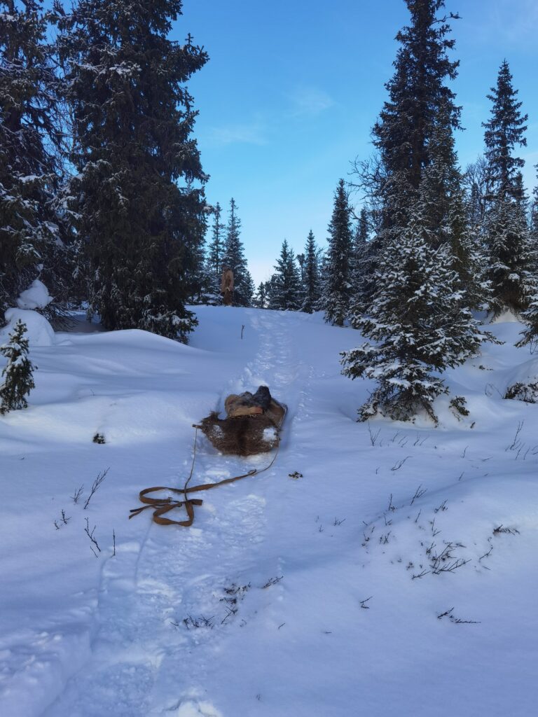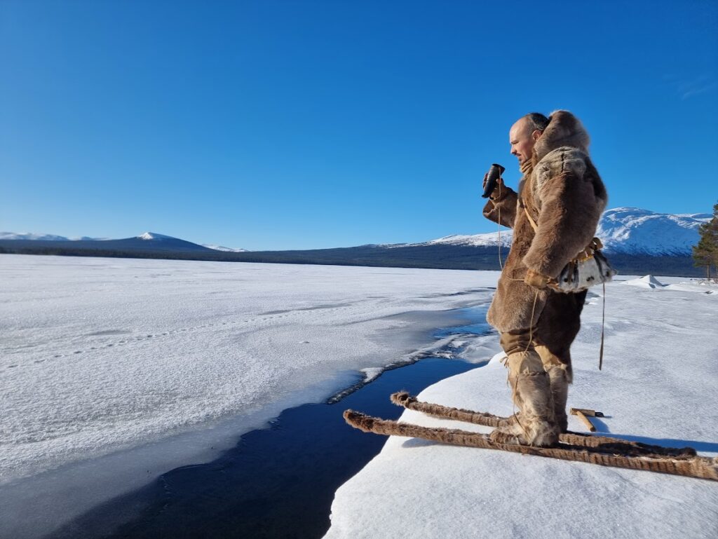 Le quatrième jour, nous préparons nos équipements pour partir expérimenter la marche de trois jours. Lors de cette marche, nous eûmes l’occasion d’éprouver le matériel dans des conditions climatiques assez changeantes, alternant entre ensoleillement et tempête de neige. Les vêtements en fourrure de renne sont bien chauds pour la marche même par -10 degrés. Il faut donc régulièrement s’arrêter pour enlever des couches de vêtements et les remettre dès que le temps change, ce qui peut arriver plusieurs fois dans la journée. En fin de journée, il faut trouver un lieu de bivouac entre les arbres pour se protéger au mieux des chutes de neige, puis faire un feu pour nous réchauffer. Produire un feu par temps froid n’est pas chose aisée, et là aussi il faut une bonne préparation du matériel ainsi que de la matière sèche et inflammable comme l’écorce de bouleau. Personnellement, les nuits à la belle étoile dans la neige furent pour moi une très bonne expérience. Mon sac de couchage en peau de renne a parfaitement rempli sa fonction. De plus, une bonne paire de chaussons en fourrure de renne pour dormir permet de garder ses pieds bien au chaud. L’une des principales difficultés fut celle de trouver de l’eau sous forme liquide pour s’hydrater. Mais heureusement, dans la nature suédoise, les rivières ou les lacs sont abondants.