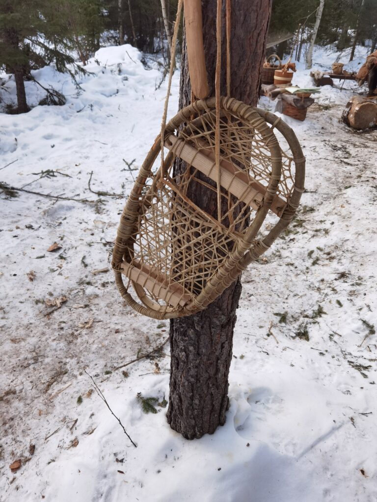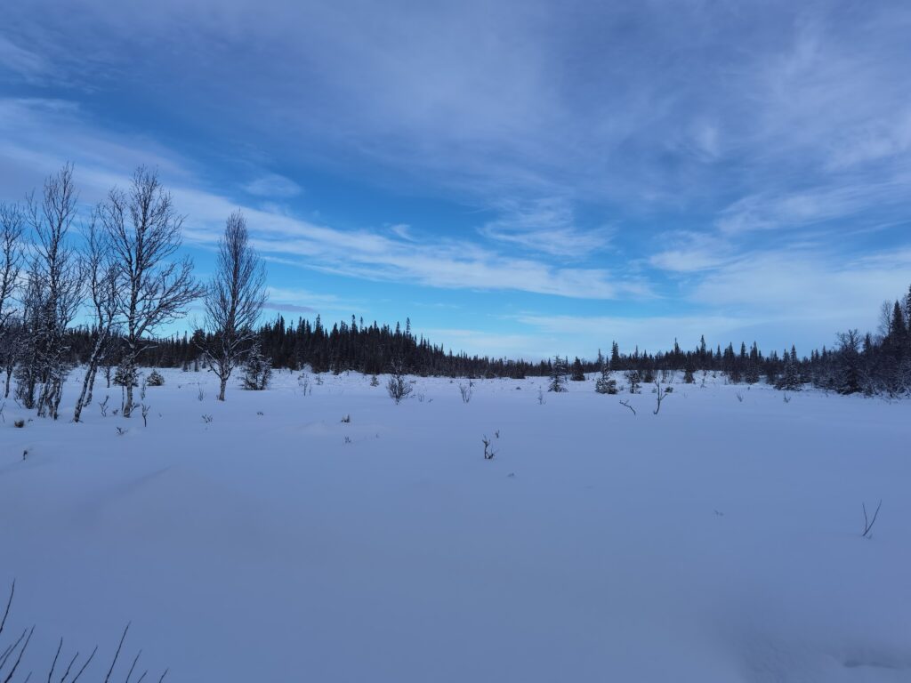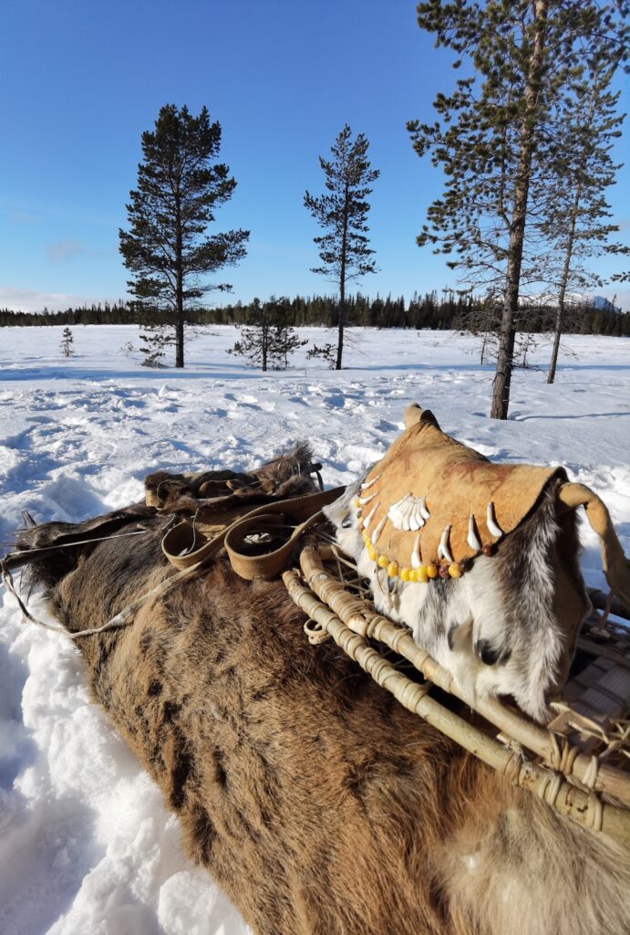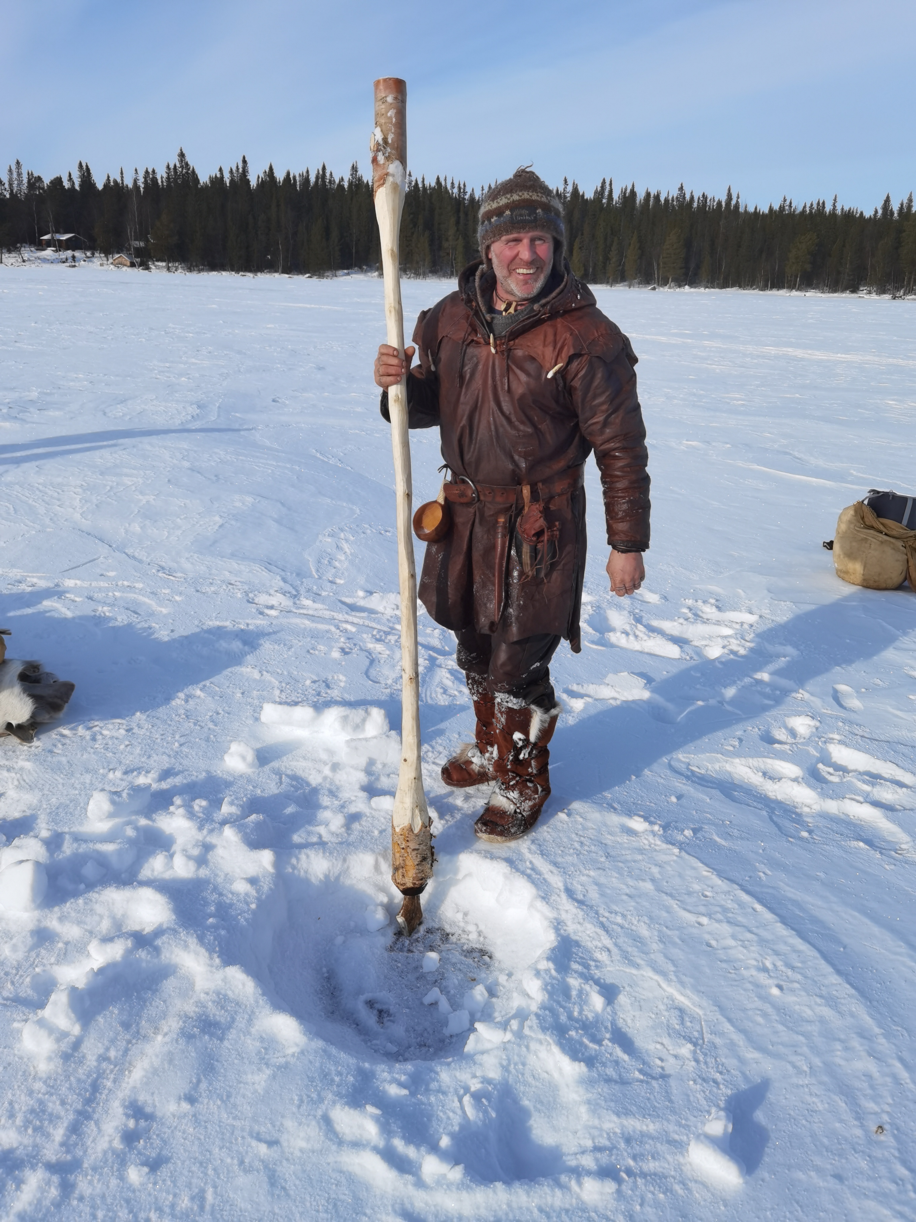 Le quatrième jour, nous préparons nos équipements pour partir expérimenter la marche de trois jours. Lors de cette marche, nous eûmes l’occasion d’éprouver le matériel dans des conditions climatiques assez changeantes, alternant entre ensoleillement et tempête de neige. Les vêtements en fourrure de renne sont bien chauds pour la marche même par -10 degrés. Il faut donc régulièrement s’arrêter pour enlever des couches de vêtements et les remettre dès que le temps change, ce qui peut arriver plusieurs fois dans la journée. En fin de journée, il faut trouver un lieu de bivouac entre les arbres pour se protéger au mieux des chutes de neige, puis faire un feu pour nous réchauffer. Produire un feu par temps froid n’est pas chose aisée, et là aussi il faut une bonne préparation du matériel ainsi que de la matière sèche et inflammable comme l’écorce de bouleau. Personnellement, les nuits à la belle étoile dans la neige furent pour moi une très bonne expérience. Mon sac de couchage en peau de renne a parfaitement rempli sa fonction. De plus, une bonne paire de chaussons en fourrure de renne pour dormir permet de garder ses pieds bien au chaud. L’une des principales difficultés fut celle de trouver de l’eau sous forme liquide pour s’hydrater. Mais heureusement, dans la nature suédoise, les rivières ou les lacs sont abondants.