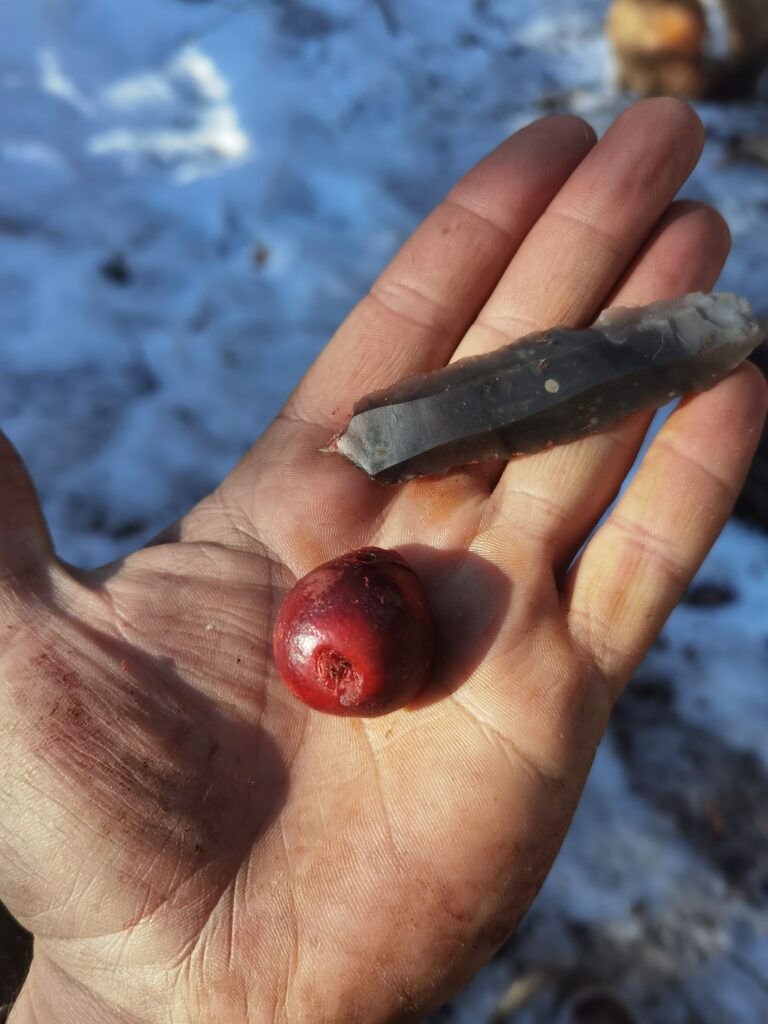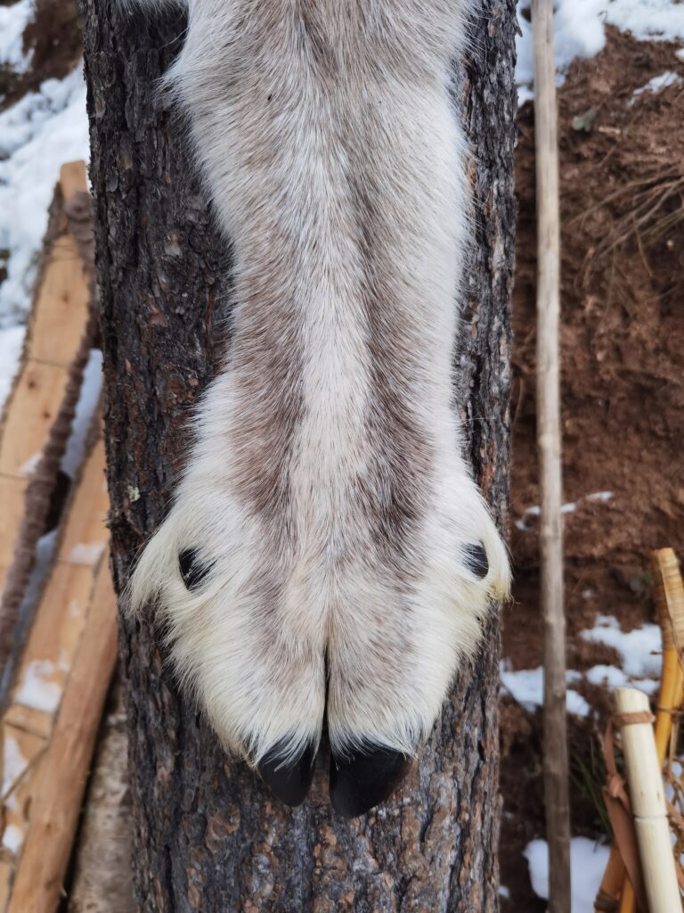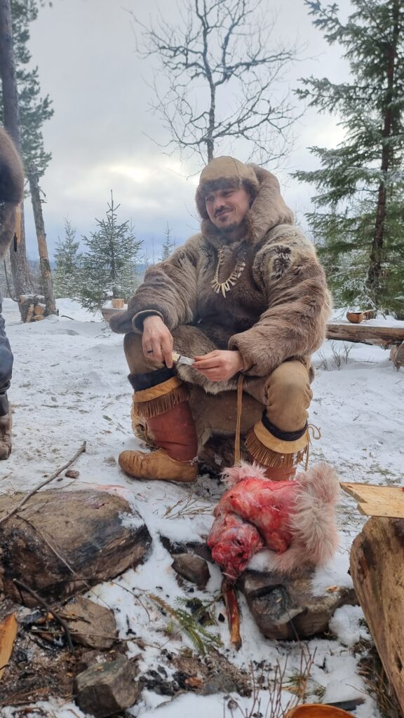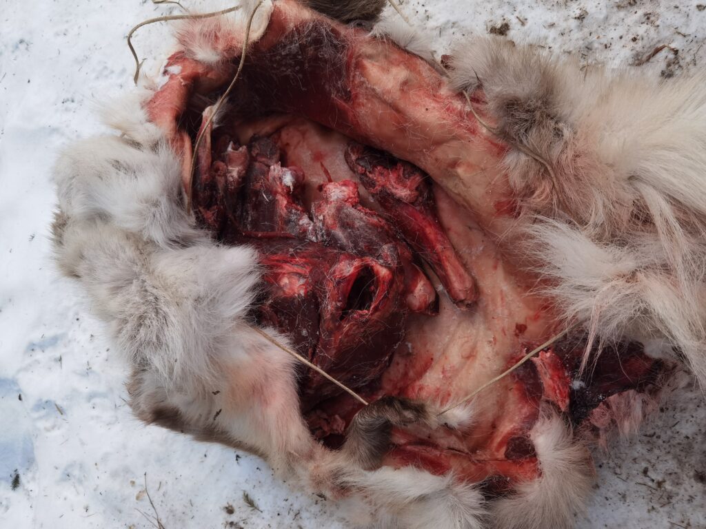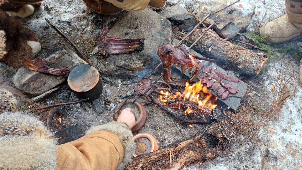 Le deuxième jour un jeune renne nous à été fourni par les éleveurs de rennes Saami, afin de préparer notre subsistance pour l’entièreté du séjour. Ce sera notre principale base alimentaire. L’animal fut entièrement dépecé et découpé à l’aide de lames de silex et de couteaux en silex. Puis la viande fut emballée dans la peau et suspendue entre les arbres pour éviter d’être mangée par d’éventuels prédateurs.