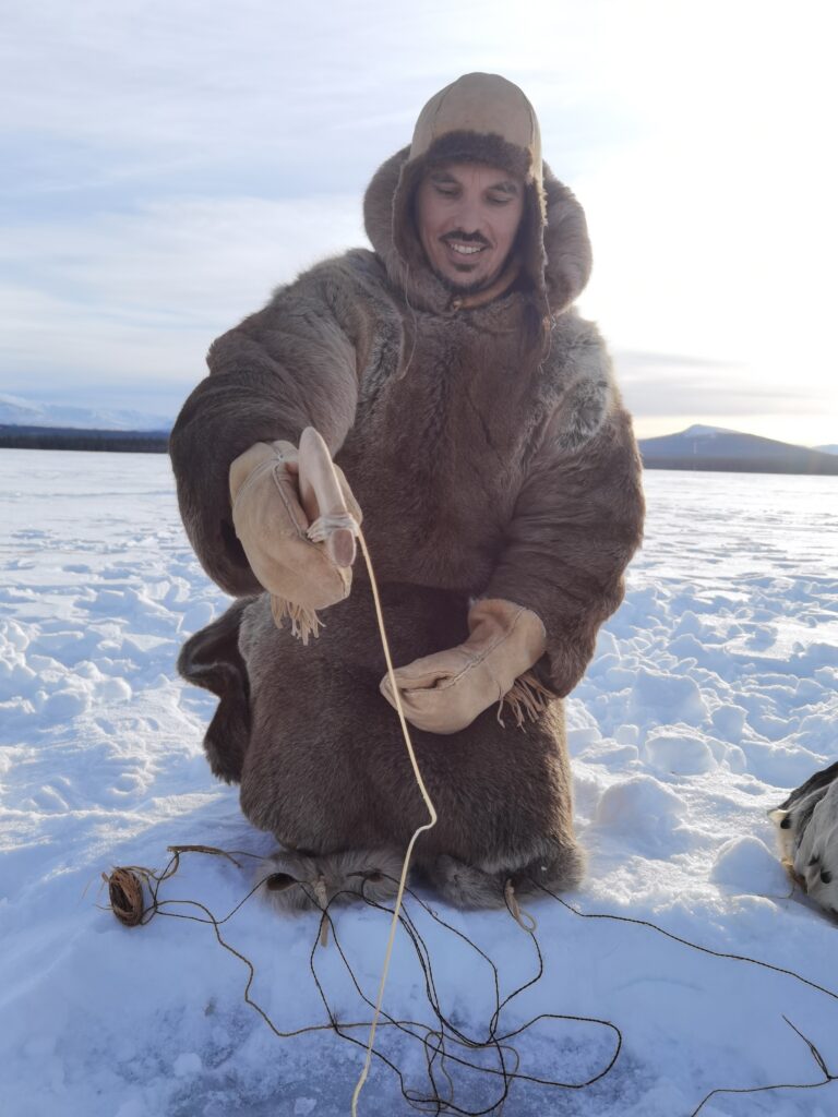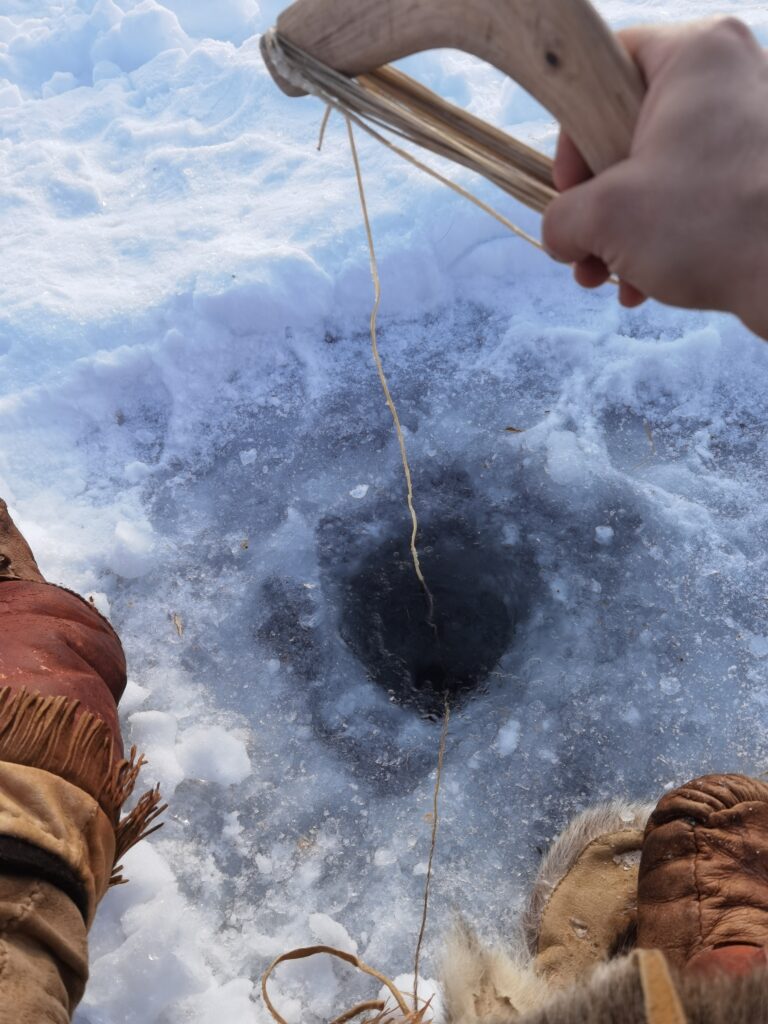 Le troisième jour, fut le jour de la pêche sur le lac gelé à quelques kilomètres du campement. Accompagnés par notre guide Richard Rees, nous nous installâmes sur la rive pour un repas de viande d’élan grillée. Puis vient le moment tant attendu par tous : le perçage de la glace. Et pour cela, il faut s’armer de patience et de courage car il faut environ une heure pour réaliser un trou d’une vingtaine de centimètres de diamètre dans une glace épaisse de 60cm. Bien que cette partie de pêche soit un échec, ce fut l’occasion de nous rendre compte des difficultés ainsi que des problèmes liés à un matériel mal adapté aux conditions (hameçons trop gros, difficulté à se procurer des appâts en conditions hivernales…).