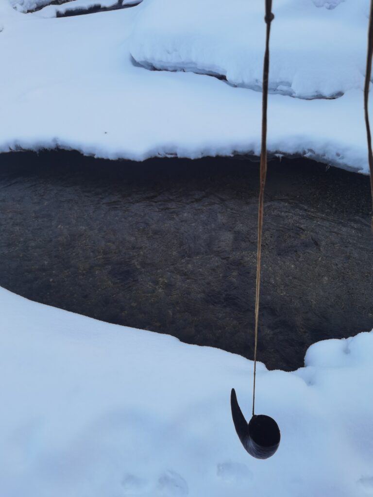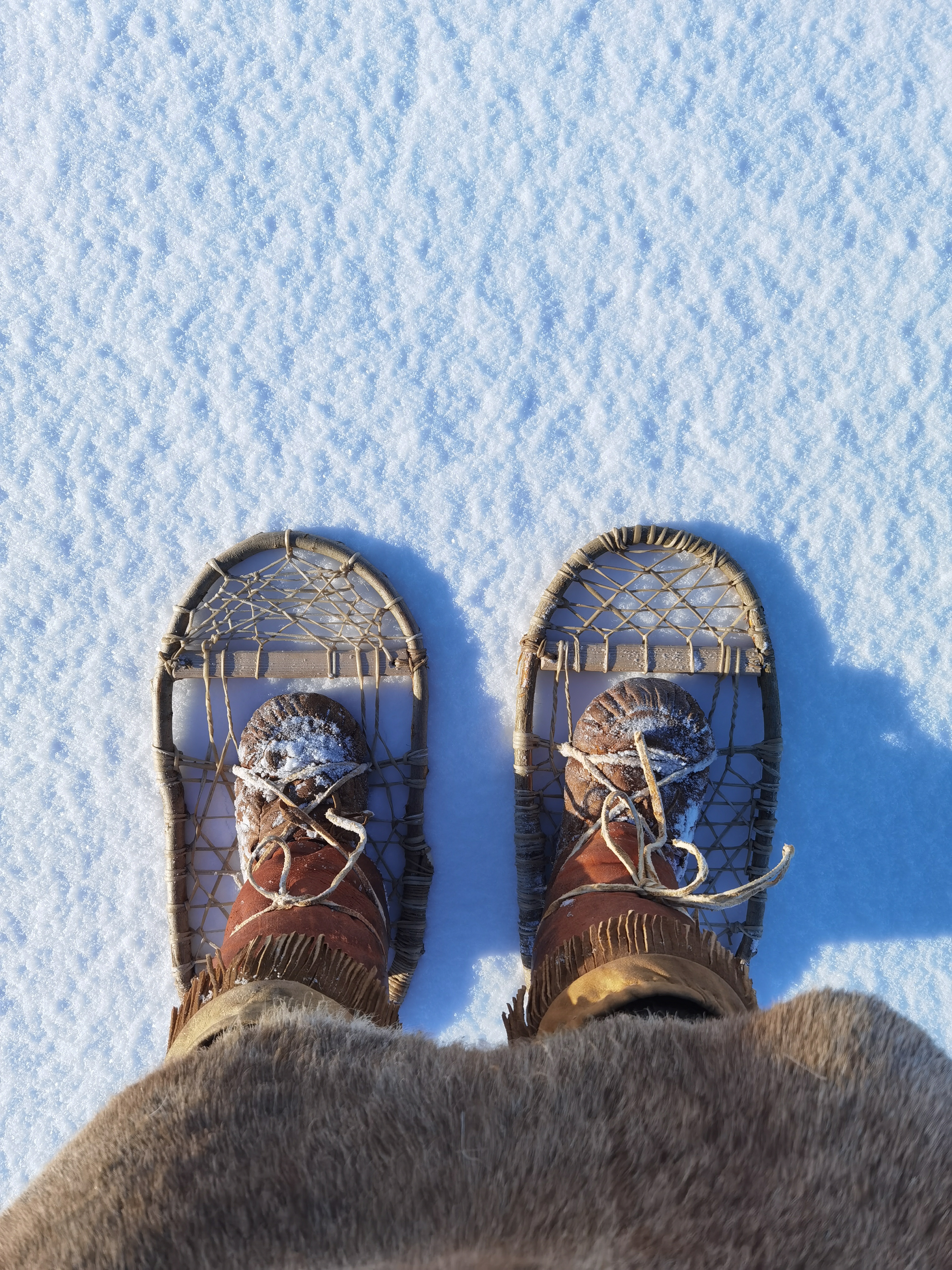 Les derniers jours, nous occupâmes nos journées essentiellement à reprendre des forces ainsi qu’à expérimenter le travail des matières animales. Ce fut également l’occasion de tester mes skis par une belle journée. Verdict! Les skis primitifs ne permettent pas de glisser réellement mais facilitent le déplacement, comme les raquettes à neige dans la neige profonde.